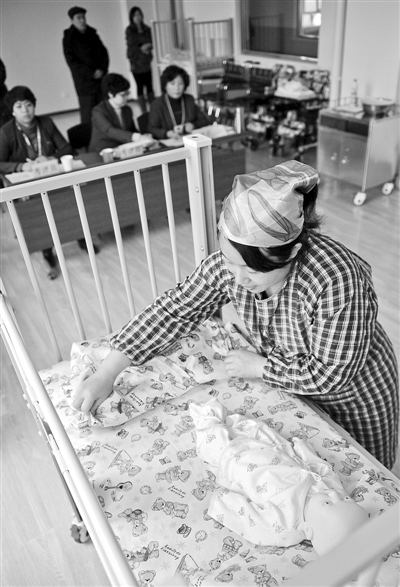1月28日,参加考试的护理员在模拟为婴儿盖被子。当日,经过15天的培训,20位参考人员在天津市儿童福利院国家孤残儿童培训基地参加了孤残儿童护理员初级资格考试,其中包括6名福利院职工、13名护工和1名寄养家庭的家长,这是天津市首次开展此项考试。