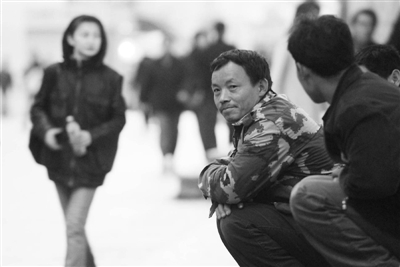 两位农民工在沈阳步行街上歇息。孙海 摄