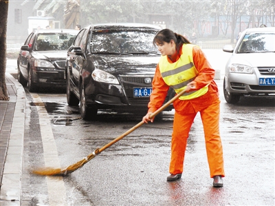 刺骨的寒风不时吹向脸颊,记者不停地吸着鼻子,裸露在空气中的双手冰冷,即使是穿着鞋子的双脚也是冰冷的。“我不冷,扫了这么多年我都习惯了,而且边走边扫,身上暖和得很,扫久了还会出汗。”杨德凤说。