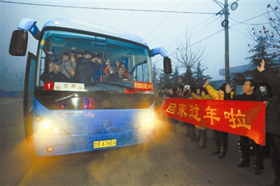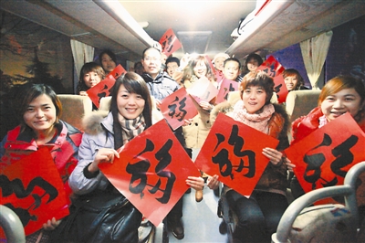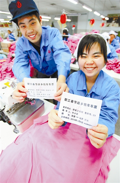 春节临近,即发集团成立专门的春运小组,包租大巴、自制车票,免费送省内的2000多名外来务工人员回家过年。据悉,该企业大部分外来务工人员将在岗位上工作到2月8日(腊月廿八)乘坐专车返乡,这既保证了企业的订单生产任务,又让外来务工人员能安全舒适的返乡过年。