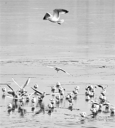 由于渤海湾冰情加重,在沿海湿地过冬的许多鸥鸟飞到市区河道入海口一带生活,给冬日里的秦皇岛市区增添了一道风景。
