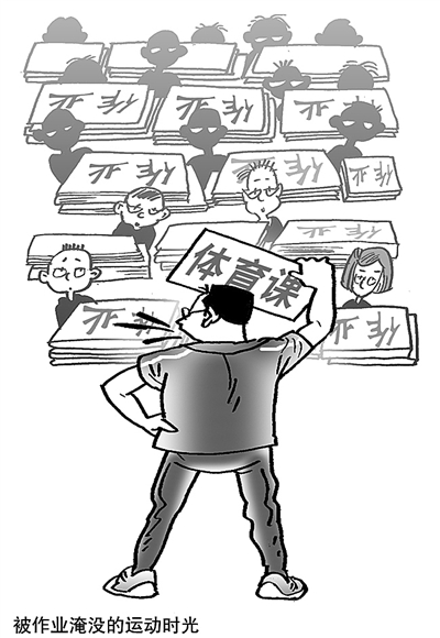 应该说,近年来,校园体育设施、社区健身器材都在不断充实、完善。但由于升学压力等因素的影响,学生课业负担较重,课业负担挤占课外体育锻炼时间、体育课的现象普遍存在,学生体质堪忧。有调查数据显示,96%的被调查学生放学回家后的主要活动就是完成作业、温习功课。29.3%的学生除了学校安排外,不参加任何体育活动。在现有的应试教育体制下,从老师到家长,都只关心孩子的文化成绩,身体方面只考虑增加营养,许多学校更是把体育当成可有可无的点缀。