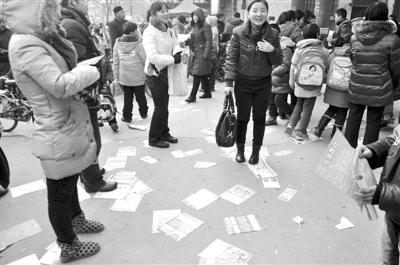 随着寒假的到来,各种各样的培训机构也忙碌起来。1月25日,在山东聊城市一小学门前,家长正在看寒假学习班广告,清理随手丢弃的广告纸张也增大了环卫工人的工作量。赵玉国 摄