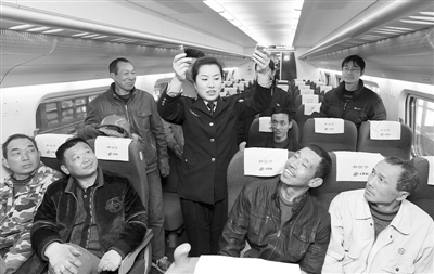1月29日,武汉铁路警方联合江岸西车站,邀请数十名农民工到站内高铁车内,向农民工开展安全出行常识及乘车防范能力教育,并详细讲解爱路护路等方面应注意的安全提示和事项。图为武汉铁路警方邀请城市务工人员体验高铁,开展安全知识宣传,讲述乘坐动车时的注意事项,加强务工人员的自身安全保护意识。