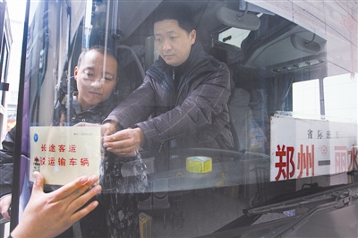 拥有接驳运输资质的长途客运车,需将交通运输部颁发的《长途客运接驳运输车辆》标识贴在客车内前挡风玻璃右侧。本报记者 于宛尼 摄