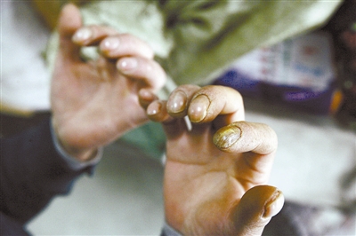 节前,包裹量增加了许多倍。普通包裹邮寄资费近12年未变,而邮寄速度比起快递并慢不了多少,尤其一些偏远地区,更能确保投递。于是许多学生、外来务工者春节返乡时就把被服等生活用品打包寄回家,方便又省钱,自己回家旅途就轻松了许多,这些沉重的包裹则让邮件转运员们的工作更加辛苦,连双手都变形了(下图)。老陈说,能为回家的人们多做点事,辛苦也值。 张培坚 摄