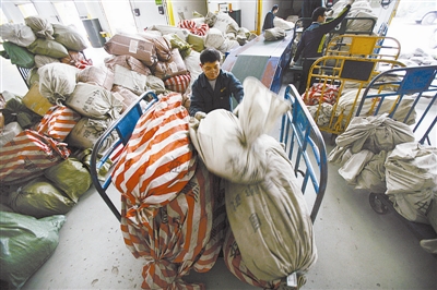 浙江宁波邮政分拣中心邮包转运车间,在邮包的包围中,邮件转运员老陈和同事们忙着核对每个包裹的信息,将它们派发到各个发送窗口(上图)。