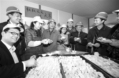 当日,江西南昌市湾里区组织20余名志愿者来到湾里第一中学异地重建校区的工地上,与30多名坚守工地而不能与家人团聚的农民工兄弟一起包饺子,贴对联,过佳节,让他们在节日里享受大家庭的温暖。