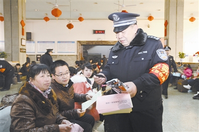 今年春运以来,山西临汾火车站派出所以火车站为主阵地,在做好旅客购票、乘车、进站秩序维护,加强安检查危和治安防控工作的同时,组织开展实名购票宣传、识别假票宣传、防范诈骗扒窃宣传以及严禁携带违禁品等的宣传活动。图为民警在向旅客进行客票调查。