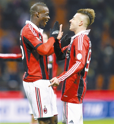 2月3日,AC米兰队球员巴洛特利(左)进球后与队友沙拉维庆祝。