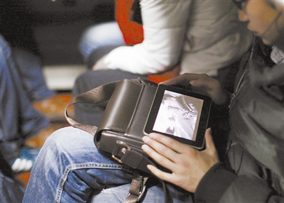 返乡途中,一位年轻人用新买的数码产品看电影。