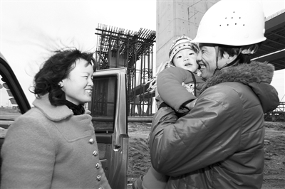 日前,在宁波务工的农民工李兴章迎来了从河南老家到工地探亲的妻子和2岁的儿子宁宁,一家三口准备在工地过年。由中铁四局二公司承建的宁波铁路枢纽北环线重点控制工程——甬江特大铁路斜拉桥工期紧,任务重。春节期间,仍有300余名农民工坚守在施工岗位,李兴章就是他们其中的一员。本报通讯员 杨继纲 李旭 摄