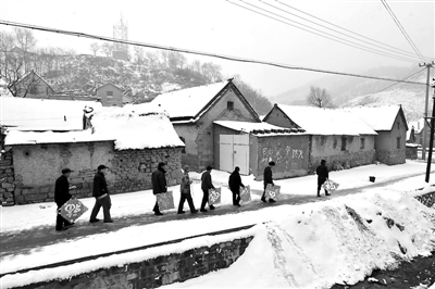 2月6日,国家电网山东淄博供电公司的“善小”志愿者服务队,冒着厚厚的积雪来到大山深处的山顶博山区山头镇池子村为乡亲们送春联、演节目,迎接新春佳节。这个村偏远且山路崎岖,交通不便。政府实施合村并居工程后,年轻人搬到山下的乡镇,还有100余位60岁以上的老人不愿离开。新华社记者 范长国 摄