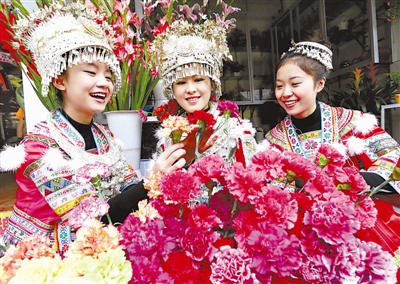 2月8日,在广西融水苗族县县城,几名苗族姑娘在花店选购鲜花。