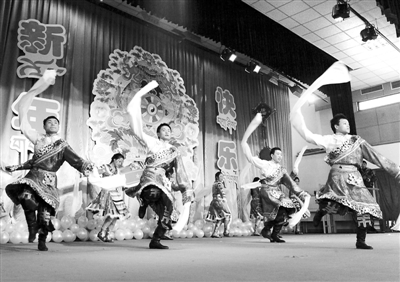 当日,北京西藏中学张灯结彩,500多名留校过年的学生们在联欢活动上载歌载舞,迎接藏历水蛇新年的到来。