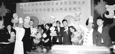 2月3日上午过了11时,在红彤彤、暖融融的气氛下,外国员工与中国员工新春团拜会开始了!大家在嬉笑逗乐中贴窗花、挂吉祥物,把现场装扮一新后,餐饮部的墨西哥小伙儿阿里纳斯身着厨师服,手举擀面杖又干上了包饺子的主厨。笔者乐了,刚才还看到他在自助餐厅指挥着做西餐,此时又俨然一个中餐师傅,先不说他会不会,就单说这架势,还着实唬人呢。