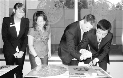 外国人过中国年,能适应吗?笔者揣着疑问,随徐韬来到自助餐厅旁的另一个房间。哇,眼前的景象让笔者十分好奇,几位高鼻梁、大眼睛、白皮肤、黑皮肤的姑娘小伙儿,正拎着红剪纸、红挂件往窗户上、墙壁上“招呼”呢。英籍驻店经理默林先生进来就嚷着要写“福”字,可笔者看得真真的,没有徐韬手把手地掌控,恐怕这“福”字半天也画不出来。笔者正偷着乐呢,徐韬解释道:其实,写也好,画也好,要的就是这个气氛,乐的是这个过程。徐韬的话,让笔者联想到年初来酒店时知道的一件事——
