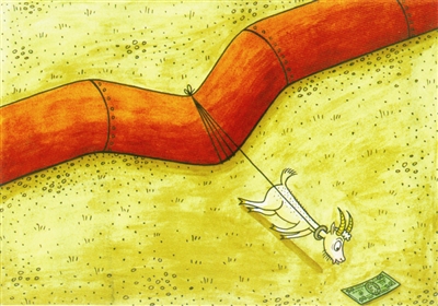 揭示“金钱诱惑”的漫画表现手段多多。乌克兰画家蒙纳斯迪尔斯基竟让见钱眼开的小羊拉弯了输油管,真绝。