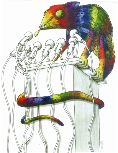 人们习惯将见机行事者比喻成变色龙。今日此类人物登台施政演说,侃侃论道。不难想见,其“承诺”会有几分可靠。