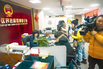 当日是农历大年初五,又是西方的情人节,2013214寓意“爱你一生爱一世”。为满足新人结婚登记需求,杭州江干区和涉外婚姻登记处推出人性化服务,从13日起安排工作人员值班,只要新人中有一方是江干区户籍或港澳台户籍,便可在这里领证。但记者采访了解到,14日上午,江干区和涉外婚姻登记处仅有3对符合条件的新人完成结婚登记手续。