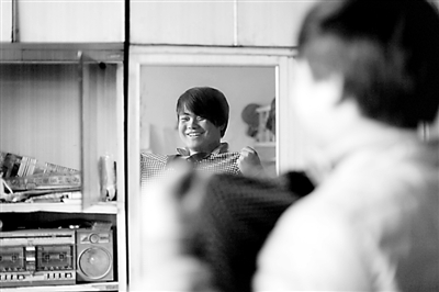 喜欢时髦的杨建涛在镜前试穿新衣 。