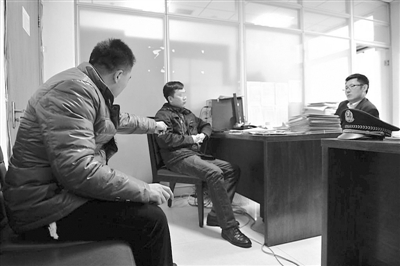 王先生(左一)用少了几截指头的手指向胡某诉说自己10年来的遭遇。 李辰 摄