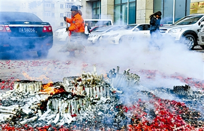 2月16日,农历春节长假后上班第一天,不少企业按照传统习俗在门口燃放鞭炮讨个好彩头,殊不知却苦了路上的行人。图为辽宁沈阳街头的一处鞭炮燃放点。潘恩战 摄