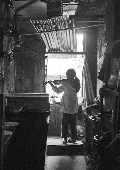 ②早晨,小晴月站在楼道公用的厨房里练琴。