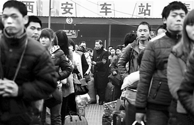 在西安火车站站前广场上的应急候车区,客运值班员曹跃建在疏导客流。今年42岁的曹跃建已经在车站工作了21个年头,年年参与春节加班,由于在春运期间实行三班倒工作制,他已经连续8年在车站度过除夕夜,今年还将继续。