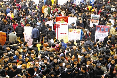 2月17日,求职者在山东省滨州市博兴县举办的春节后首场大型招聘会上寻找工作机会。当日,博兴县举办春节后首场大型现场招聘会,吸引了上万名求职者前来应聘。