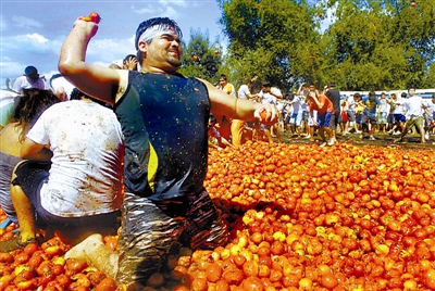 当地时间2月16日,在智利康塞普西翁市魁隆上演精彩的“番茄大战”,狂欢的民众在红色的海洋里HIGH翻天。