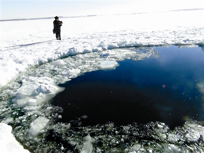 图为俄罗斯车里雅宾斯克地区遭到陨石冲击后,在切巴尔库尔湖面上形成一个直径6米的冰窟窿,但潜水员并未在湖中找到陨石的痕迹。谢涛 供图