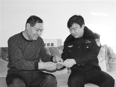 图为处长姚勇把2000元钱交到重困民警王国军的手上。