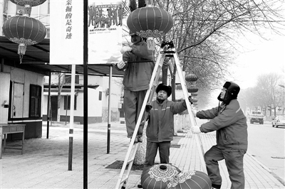 元宵节临近,中原油田采油四厂在厂区路两旁挂起了红灯笼,将获得年度模范集体的照片放大悬挂在街道两边,以此激励全厂员工在平凡的工作岗位上再创佳绩。图为工作人员正在悬挂模范集体、油藏经营管理五区27号油水站“全家福”照片。赵则阳 丰建法 摄