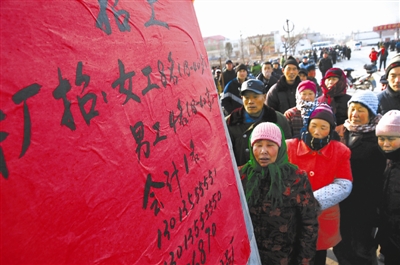 图为打工者在“春季用工见面会”上查看雇主张贴的招工启事。