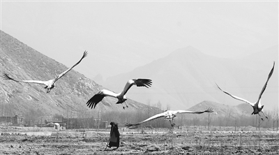 近年来,由于西藏不断加大保护力度,在西藏山南地区雅鲁藏布江中游河谷黑颈鹤国家级自然保护区,国家一级保护动物黑颈鹤数量逐渐增多。黑颈鹤属高原特有鹤类、世界濒危物种,历来备受藏族同胞喜爱,被誉为“雪域神鸟”。目前西藏的黑颈鹤总数已超过8000只,占全球总数的八成以上。这是黑颈鹤在农田里觅食。