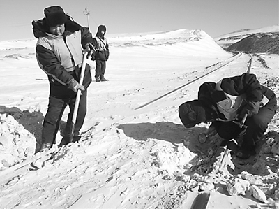 地处严寒地带的通辽工务段在春运攻坚战中,坚持“安全第一、预防为主”的原则,在雪埋铁道地段实施手工探伤检查作业中,采取用手扒开接头部位,仔细察看、检查,消除死角,防患于未然。图为该段沙尔塔拉线路车间职工正在雪害地段进行线路接头检查作业。李明宝 摄