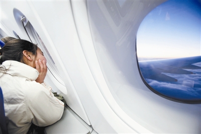 飞行途中一位参加活动的小同学望着机舱外的天空(2月21日摄)。