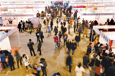 2月23日至24日,2013年春季北京地区人力资源招聘会在中国国际展览中心举行。参会的800余家企业共提供约2.5万个就业岗位,面向应届高校毕业生及社会各类人才进行招聘。招聘单位中民营企业占逾八成。据悉,招聘会首日吸引超过4万人进场。本报记者 王叔坤 摄