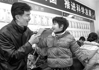 2月25日,重庆市渝北区洛碛镇中心小学一年级的白渝佳(中)在志愿者的帮助下背上新书包。