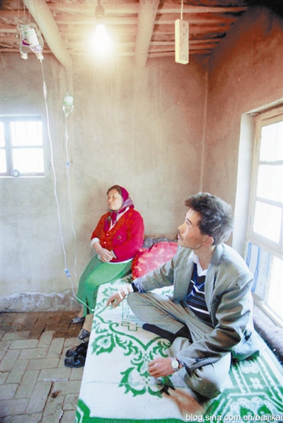 患上胆囊炎的热合曼在简陋的乡村诊所里打点滴,6种药里5种是维生素。