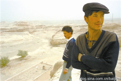 烈日炙烤戈壁,热合曼(左)站在石窟顶上,注视着不远处那两棵代表着希望的榆树,它们是几十平方公里内仅有的绿色。