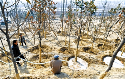 2月22日上午,西安市文景山公园项目施工工地上,工作人员在山坡上为树木浇水。目前,公园内已种植槐树、法桐、玉兰等多个品种的树木1500余棵。此前,这里是渭河古河道,有大大小小40余个沙坑,经建筑垃圾回填造山,形成一道美丽的人造景观。张喆 摄