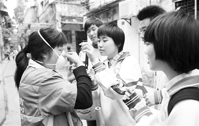 “这种口罩好,透气多了,干起活来更来劲了!”24日上午,广州市生命缘志愿者协会与一班中学生志愿者“快闪”到荔湾区岭南街,为辖区内部分环卫工送上“快闪礼包”———防PM 2.5微粒的专用口罩。志愿者们为环卫工人戴上口罩,并教他们使用和保养 。 冯宙锋/摄