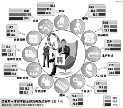 2月20日,上海,国内某人力资源有限公司研究中心最新发布的《2013年中国企业招聘趋势调研》显示,58.8%的受访企业计划增编,26.1%的受访企业计划减员。在计划增编的企业中,需求量最高的三个岗位依次是销售、研发、生产制造。CFP/供图