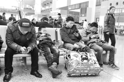 上海虹桥车站,候车的年轻务工者们拿着手机上网看新闻的景象很常见。 贺友保 摄