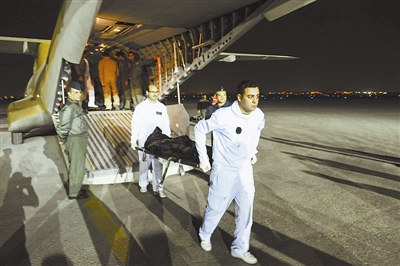 2月26日,在埃及开罗,医护人员将埃及卢克索热气球事故遇难者遗体抬下飞机。