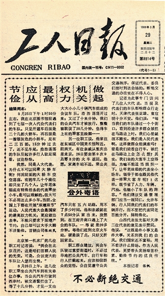 报道中,北京市第一机床厂的几位职工向本报写信反映,“代表车队里,除了开道车后跟着20多辆大轿车,再后面的一溜银灰色小轿车,足足有二三百辆,15分钟过去了,也不见车尾,行人议论纷纷”。