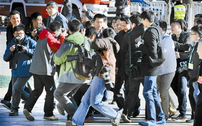 3月4日上午,第十二届全国人大第一次会议召开预备会,这是在人民大会堂东门外,记者们围追堵截李小鹏代表请求回答问题的一个镜头。