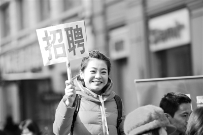 3月3日,黑龙江省哈尔滨市庆“三八”—— “春风送岗位”创业就业招聘大会在哈尔滨中央大街举行。图为一家招聘企业的工作人员手举“招聘”字样的牌子。 新华社记者 王 凯 摄